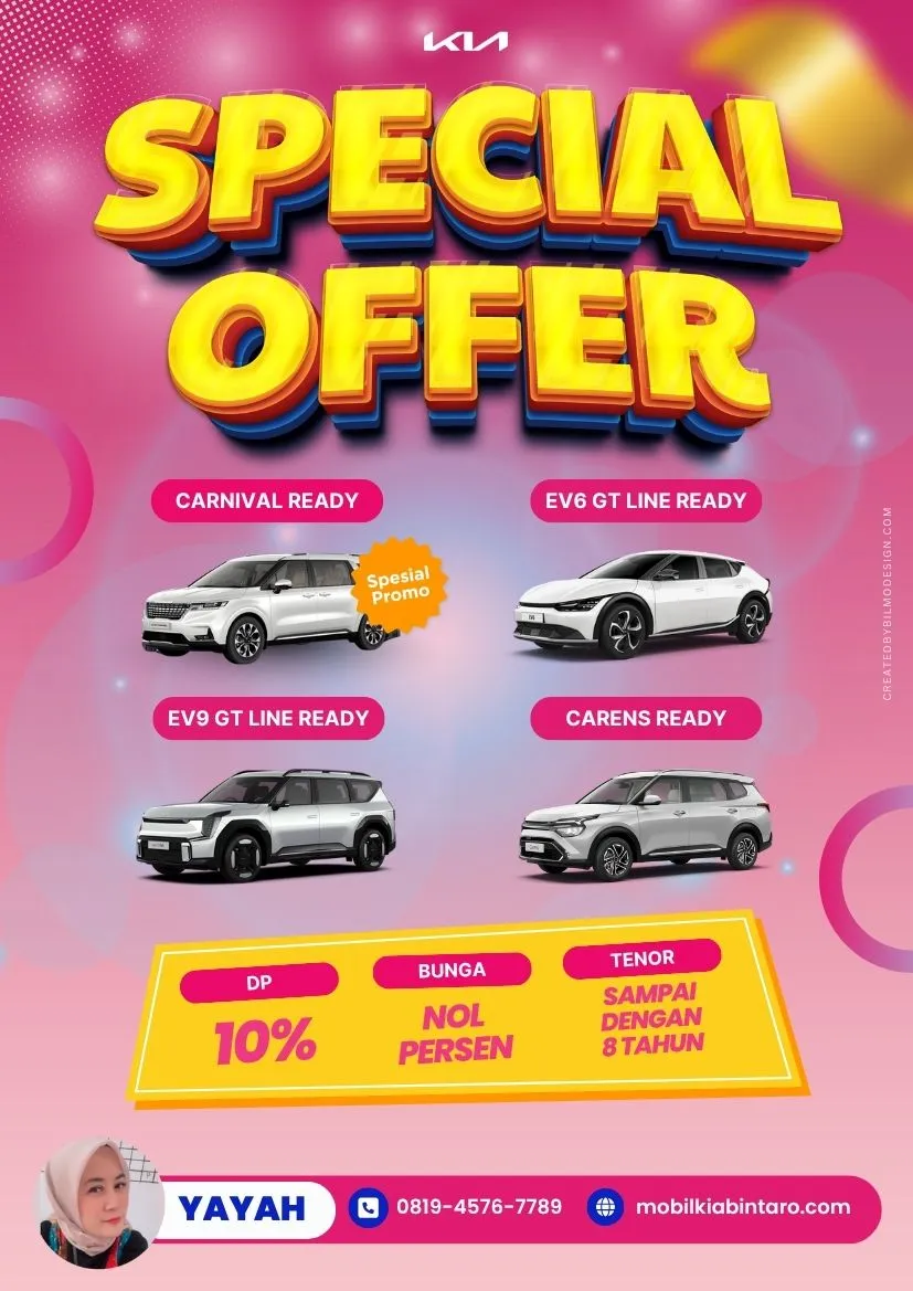 Saya Yayah, Sales Mobil KIA Resmi yang menjual mobil KIA baru bergaransi, silahkan Anda melihat daftar yang ada dan pilih mana yang Anda suka, saya siap membantu dan menjawab segala pertanyaan Anda. Hubungi saya melalui Nomor Telepon/Whatsapp yang ada di bagian informasi Contact, Anda pun dapat memperoleh info apapun seputar KIA kepada saya.